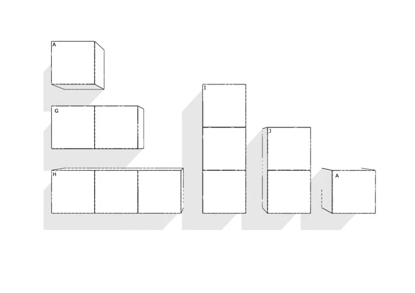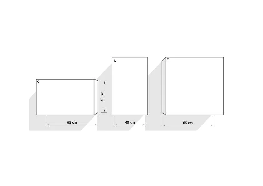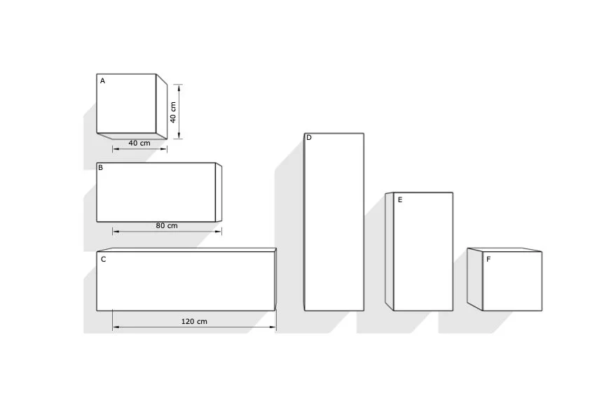 Vi jobber med faste moduler Dybde 40cm som kan settes sammen i ønsket kombinasjon i liggende og i stående format:
